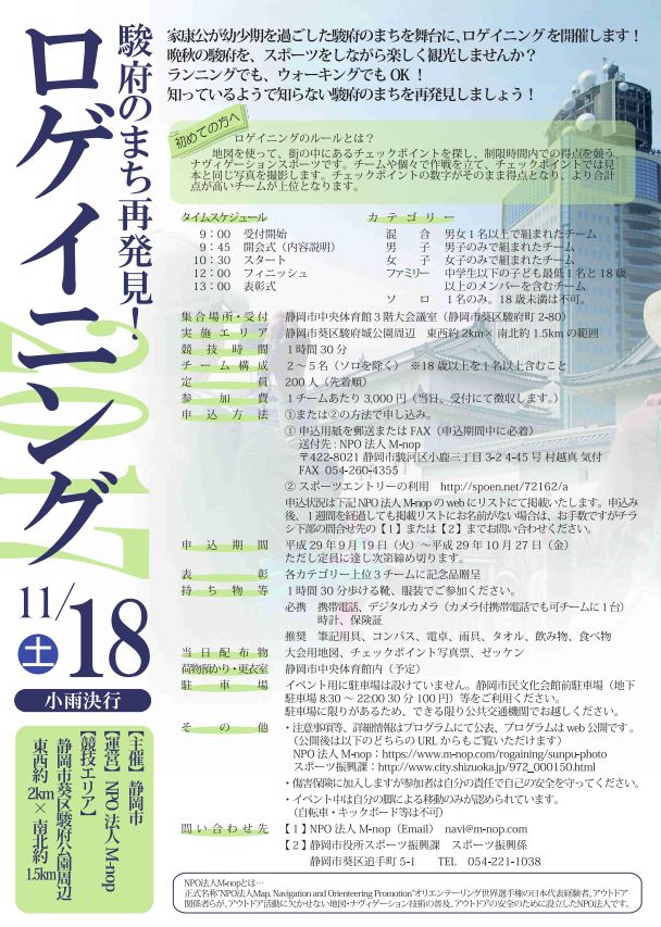 11月18日(土)に静岡市葵区駿府城公園周辺にて「駿府のまち再発見!ロゲイニング2017」が開催されます。