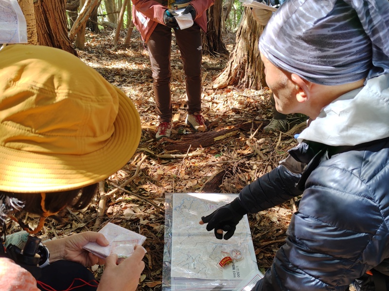 今回藤枝市にあるつたの細道公園を基点に、眺望がすばらしい満観峰山頂を目指し、別ルートで宇津ノ谷峠を経由して戻って来るコースを利用しました。尾根に乗るまでの傾斜は急ですが、途中の谷道や稜線に乗ってからのトレイルは傾斜の緩いコースでした。言い方を変えると地形がはっきりしない場所も多くなるため、地図読みがしやすい場所を指導ポイントに選ぶなど少し工夫が必要でしたが、皆さんには地形把握やコンパスを使った方向確認の重要性を実感していただけたのではないかと思います。