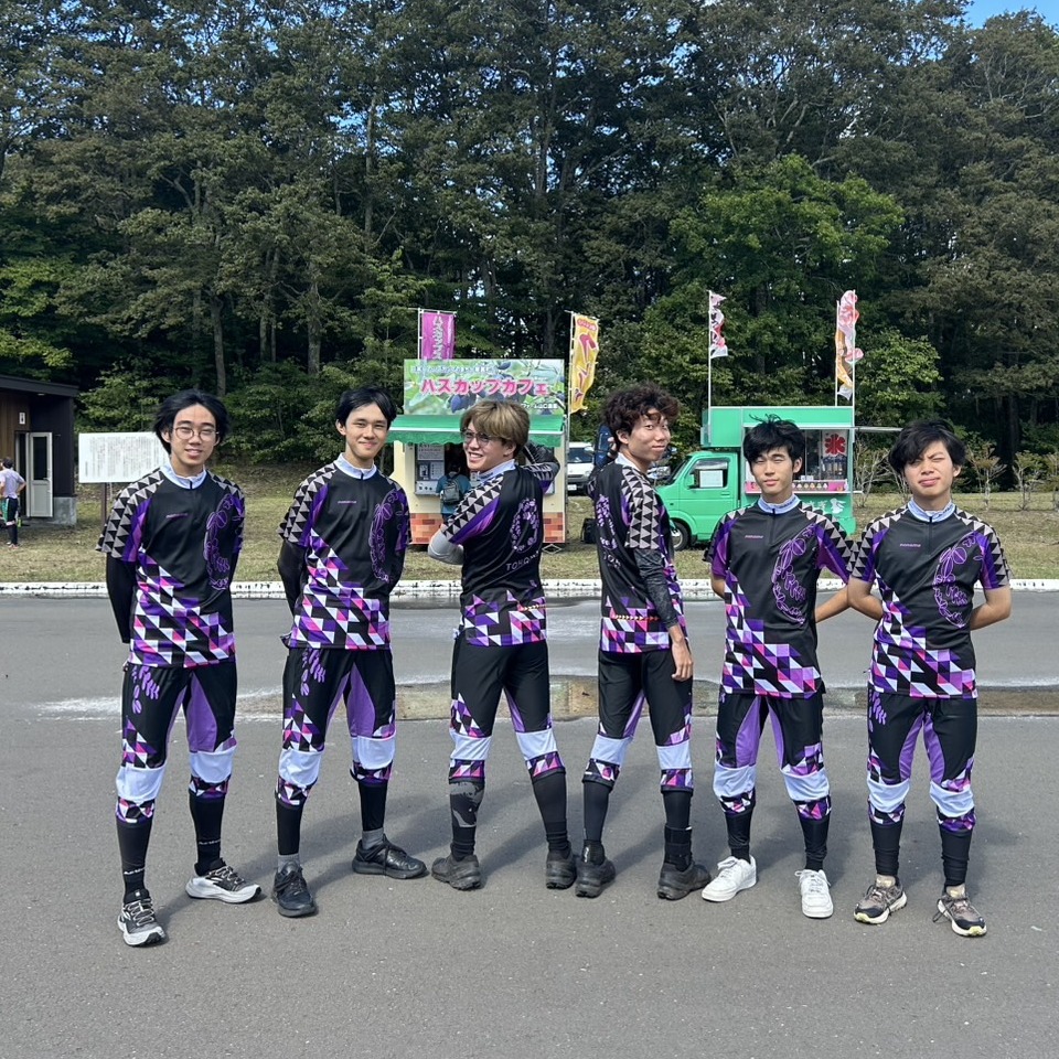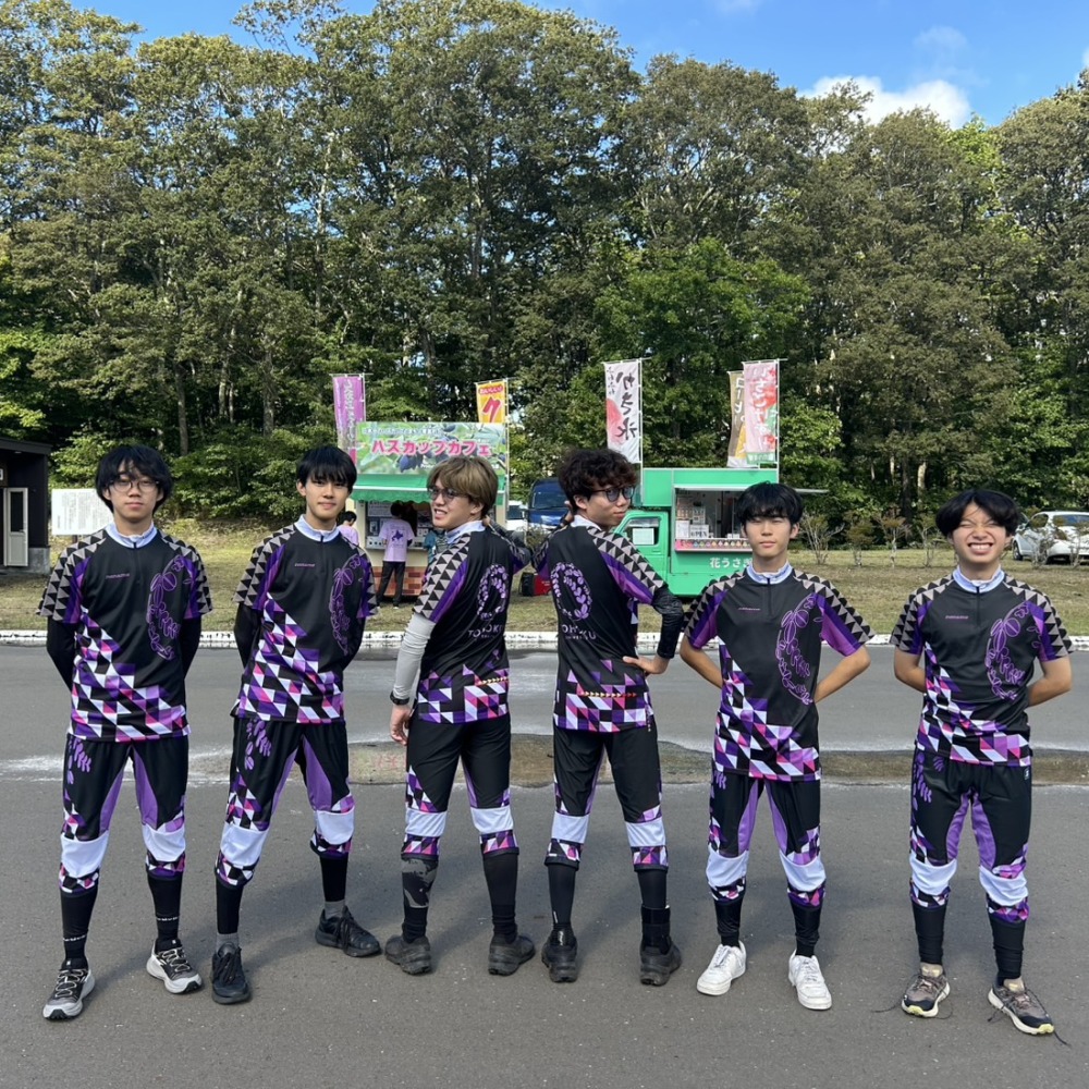 学生オリエンテーリング界の伝統校、東北大学。O-Support創業の2009年から毎年ウェアを作成いただいております。近年ではシャツは2種類をご注文いただくことが多く、いずれも皆さんで考えたオリジナルデザインを基に作成しております。伝統的に紫や黒を基調としたカラーで、萩の校章やインカレ団体戦優勝回数を記したトライアングルを入れ込むことも受け継がれています。2024年は工程上の問題もあってパンツにオーダーメイドでは初となるターミネーターFLEXをご採用いただきました。