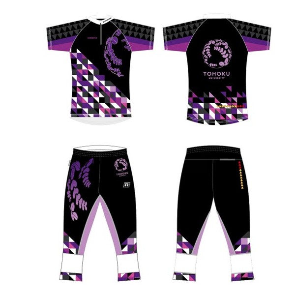 毎年学年ごとにデザインを作成されている東北大学。2025年度も大学の公式カラーである黒と紫を基調にしたデザインを学生の皆さんで考え、それに合わせてデザイナーが調整を行いました。全体的にはダークな色合いながら三角形と四角形を組み合わせた幾何学模様や膝周りのホワイトのおかげで明るさも持つデザインに仕上がっています。
