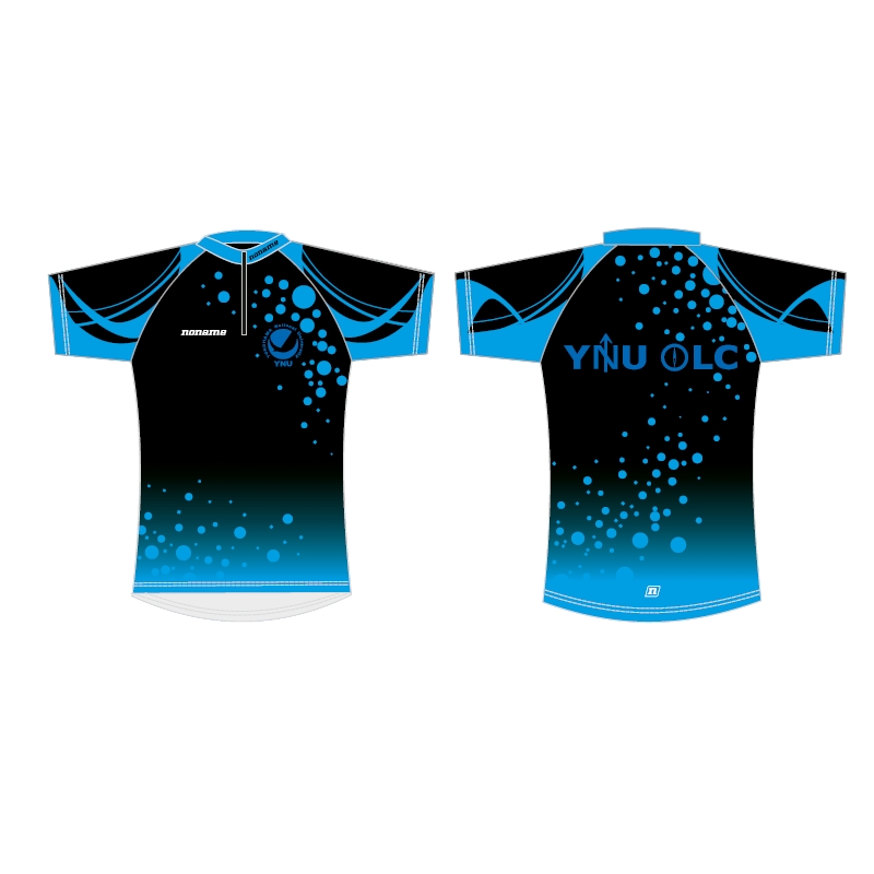 横浜国立大学オリエンテーリング部からは2013年よりデザインを変えず、定期的にチームウェアの作成をご依頼いただいております。クラブ員の方が作成したデザインはほぼそのまま製品に仕立てることができる完ぺきなデザインでした。黒と水色を基調にドット柄を配置したデザインは宇宙をイメージさせますが、皆さんが通学に使われるであろう横浜市営地下鉄のカラーもモチーフにしているのではないかと(誠に勝手ながら)想像しています。